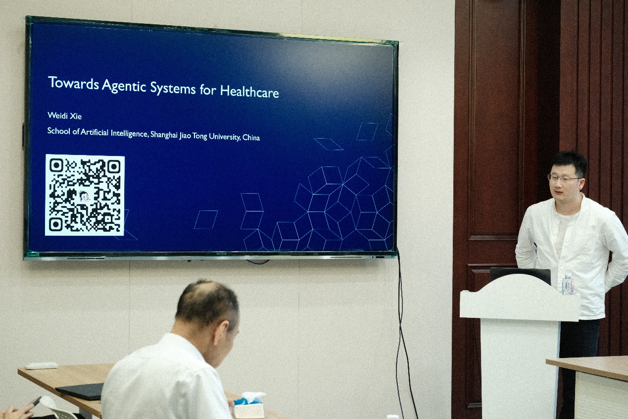 第二场报告是上海交通大学长聘副教授谢伟迪的基于多智能体的通用医疗系统的报告。报告探讨了“迈向多智能体的医学通用模型”的路线与挑战。首先回顾了通用医学模型在多模态数据与跨任务迁移中的现状与局限;随后提出多智能体协作框架:由诊断、治疗建议、影像解读与知识校验等专长代理组成,通过角色分工、协作协议与争端解析实现可解释、稳健与可溯源的临床推理。最后展示在罕见病诊断与临床工作流对接中的实验与原型系统,旨在弥合通用人工智能的进展与医疗应用之间的差距,为医疗领域提供更加健壮和多功能的人工智能解决方案。